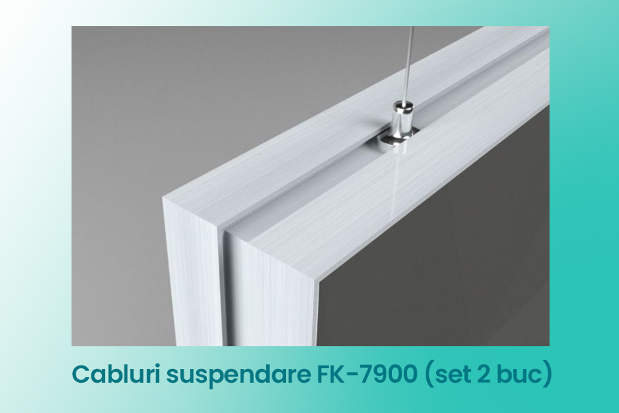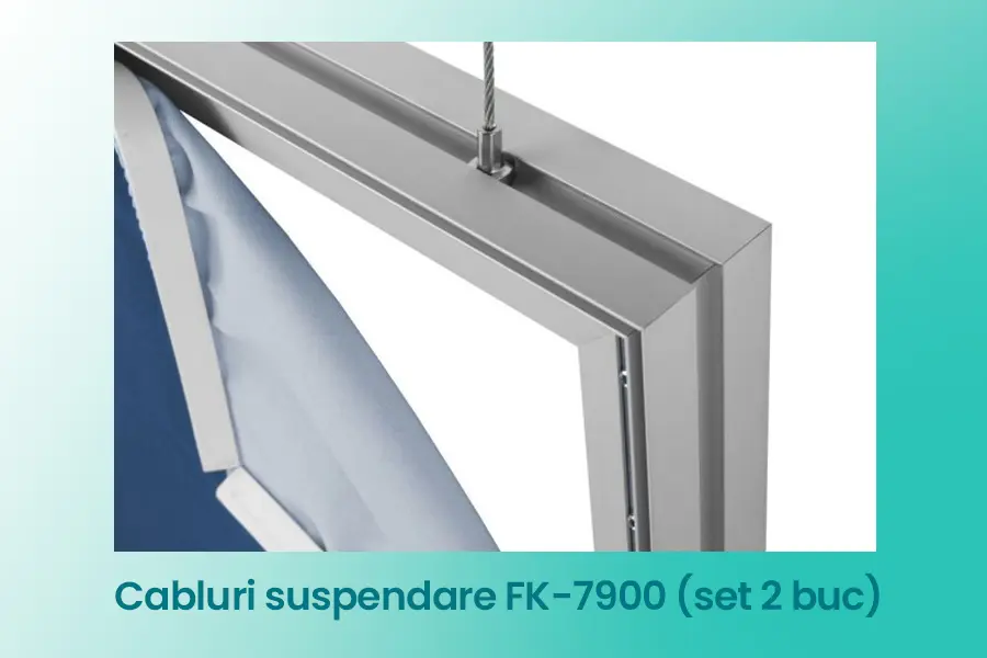 Cablurile de suspendare FK-7900 (set 2 buc) sunt soluția profesională pentru montajul suspendat al ramelor textile și LED de tavan, fiind utilizate frecvent în showroom-uri, spații comerciale, expoziții și standuri de prezentare.