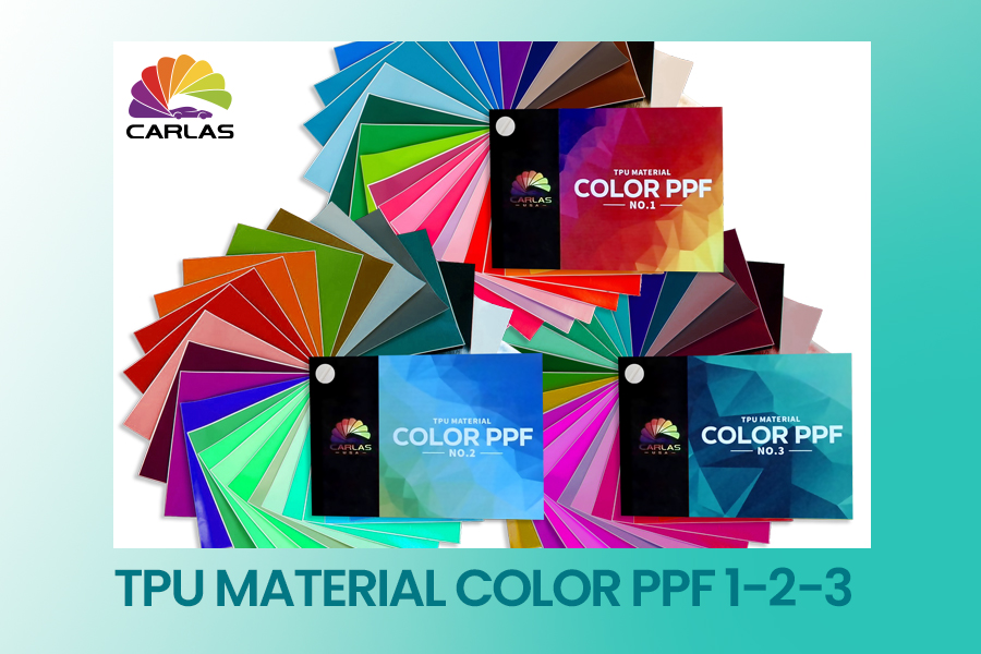 Setul include 3 cataloage de mostre PPF colorate, corespunzătoare seriilor Color PPF No.1, No.2 și No.3, fiecare cu o selecție extinsă de culori și nuanțe disponibile în portofoliul Carlas.