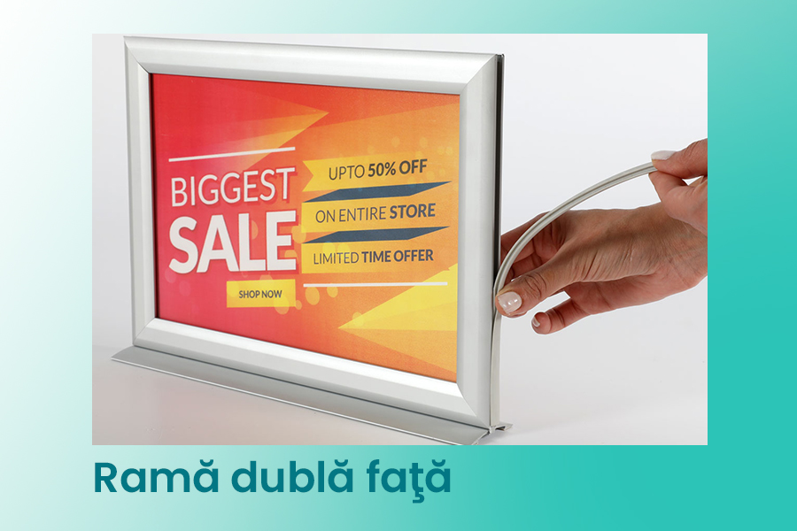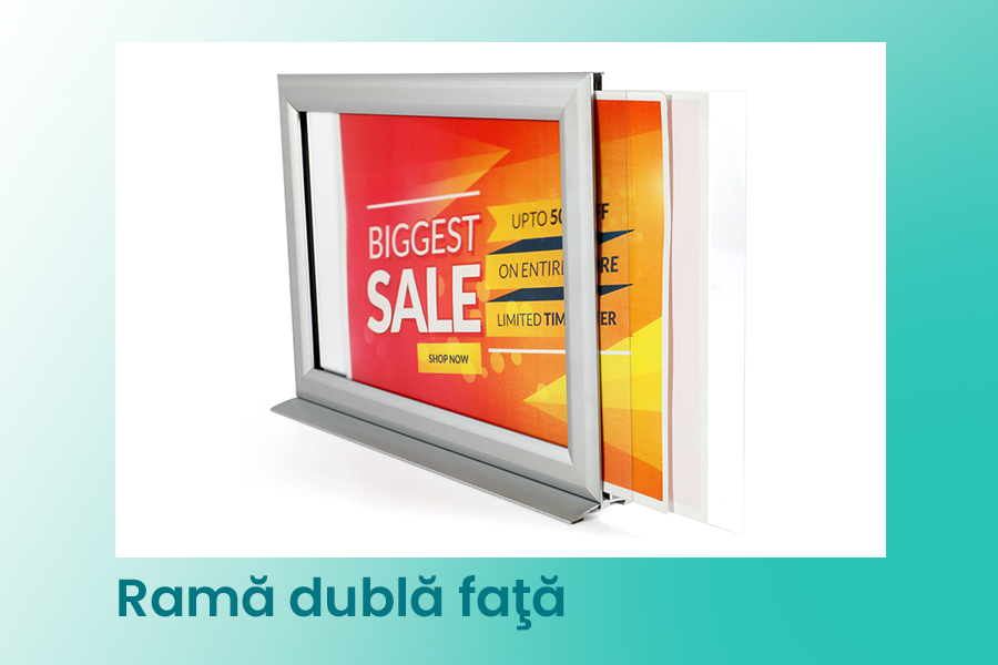 Sistemul „slide-in” permite introducerea rapidă a posterului din lateral, fără necesitatea demontării complete, iar cele două feţe vizibile (faţă şi verso) asigură vizibilitate maximă din ambele direcţii de trafic. Două folii PET transparente include protejează conţinutul printat şi prelungesc durabilitatea afișajului.